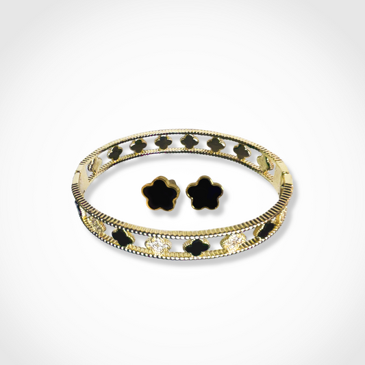 Gold & Black Clover Earring and Bangle Jewelry Set